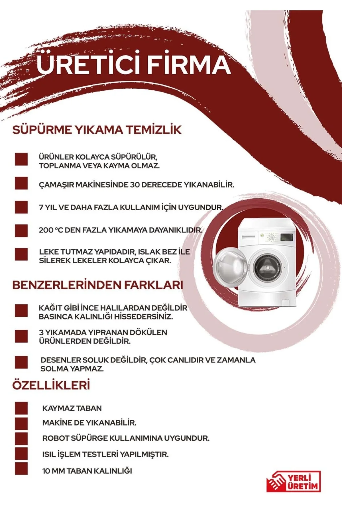 Orta hav yüksekliği (6; 12 mm) ile konforlu bir dokunuş sunar ve ayaklarınızın altında yumuşak bir his bırakır; Yıkanabilir özelliği sayesinde, leke ve kirler kolayca temizlenebilir, böylece halının ilk günkü gibi kalmasını sağlar; Bambu materyali ile doğal ve çevre dostu bir kullanım sunar; dayanıklılığı ve yumuşaklığıyla dikkat çeker; Salon ve oturma odası gibi alanlarda ideal kullanım için tasarlanmıştır; mekanınıza sıcaklık ve şıklık katar; Dijital baskı teknolojisi ile üretilmiş canlı ve net desenler, uzun süre solma yapmadan estetik görünümünü korur; Örgü saçak detayları ile modern ve klasik çizgileri bir arada sunarak dekorasyonunuza zarif bir dokunuş ekler; Suni deri taban yapısı sayesinde kaymaz özelliğe sahiptir; güvenli adımlar için ekstra konfor sağlar; Dikdörtgen şekliyle çeşitli oda düzenlerine kolayca uyum sağlar ve mekânınızda harmonik bir bütünlük oluşturur;